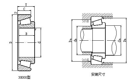 | 現(xiàn)型號 | 原型號 | d | D | T | B | C | r1min | r2min | 動 | 靜 | 脂 | 油 | ㎏ |